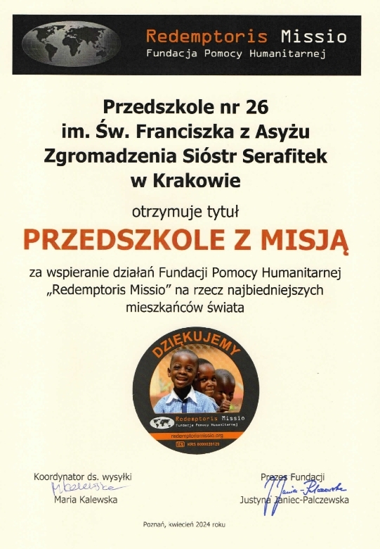 Z ogromną radością chcielibyśmy przyznać Waszej placówce tytuł „PRZEDSZKOLE Z MISJĄ”.