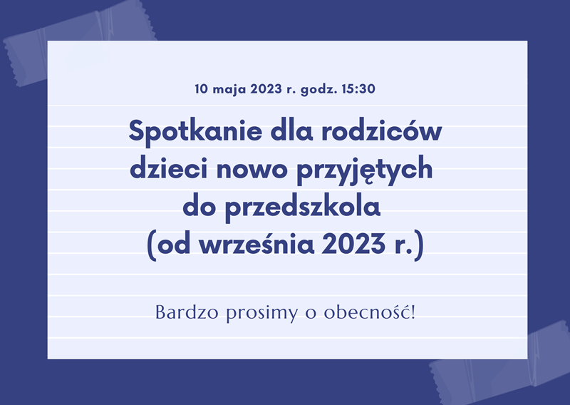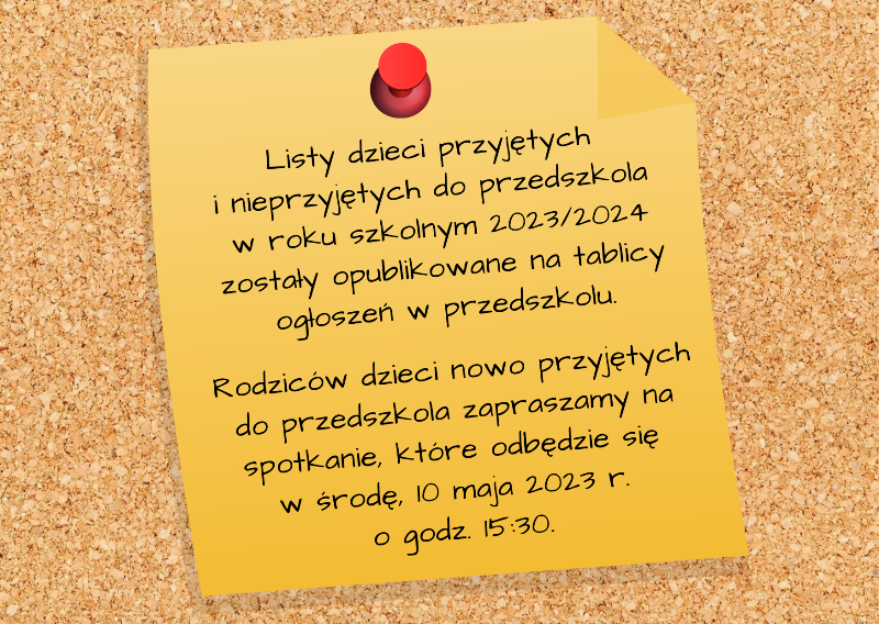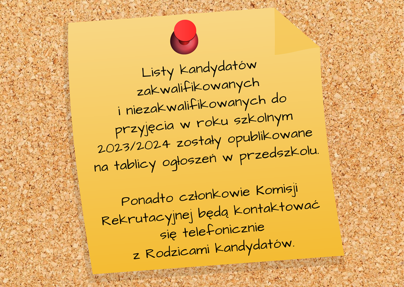 Informacja dla rodziców kandydatów do przyjęcia do przedszkola w roku szkolnym 2023/2024 (lista opublikowana 14. 04. 2023 r.) Więcej informacji: https://przedszkole26.pl/o-przedszkolu/rekrutacja-do-przedszkola
